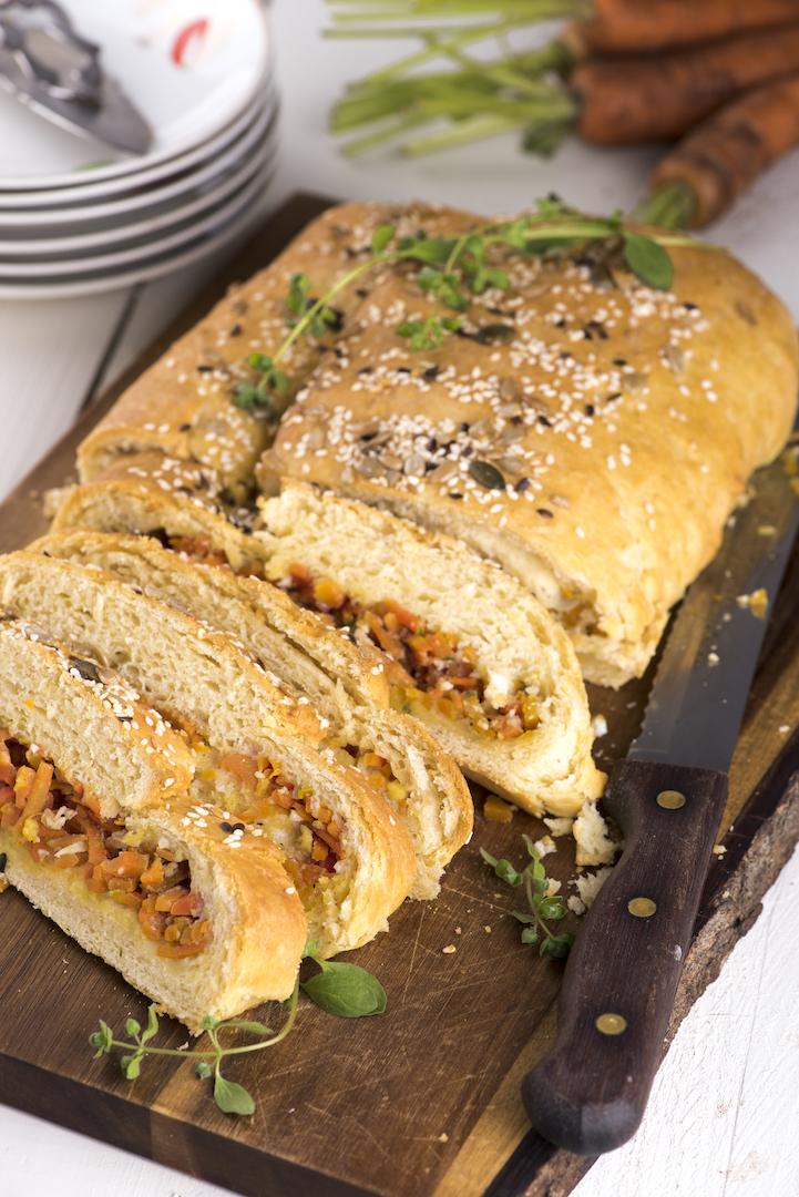 Roll up the dough into a 3 mm thick piece (35*25-30 cm), spread the filling along the dough, lift the edges on top of each other and pinch tightly together. Let the pie rise a bit before putting it into the oven. Brush the pie with whisked egg and bake at 180 °C until golden brown.