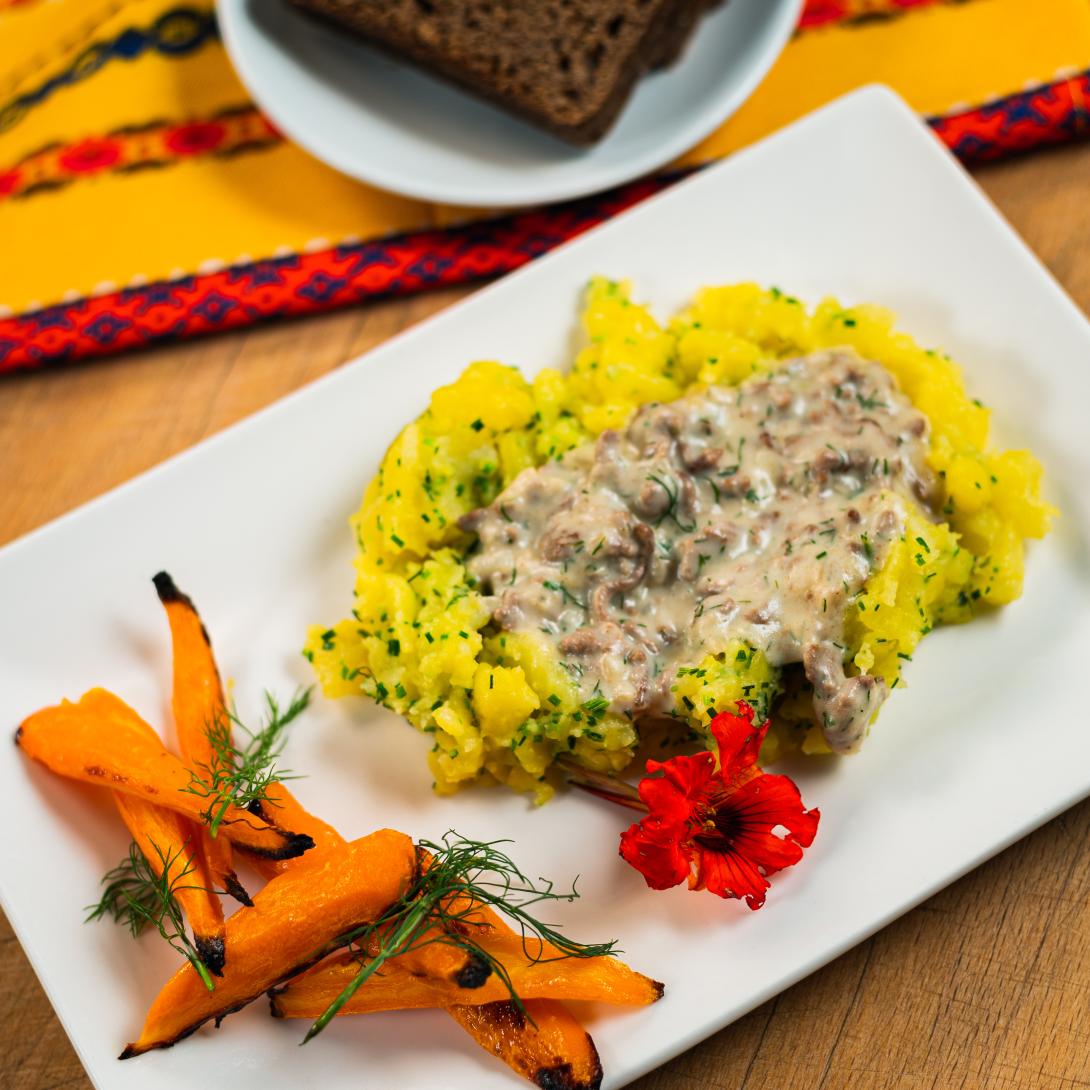 Hakklihakaste kartulitambi ja röstitud porgandiga