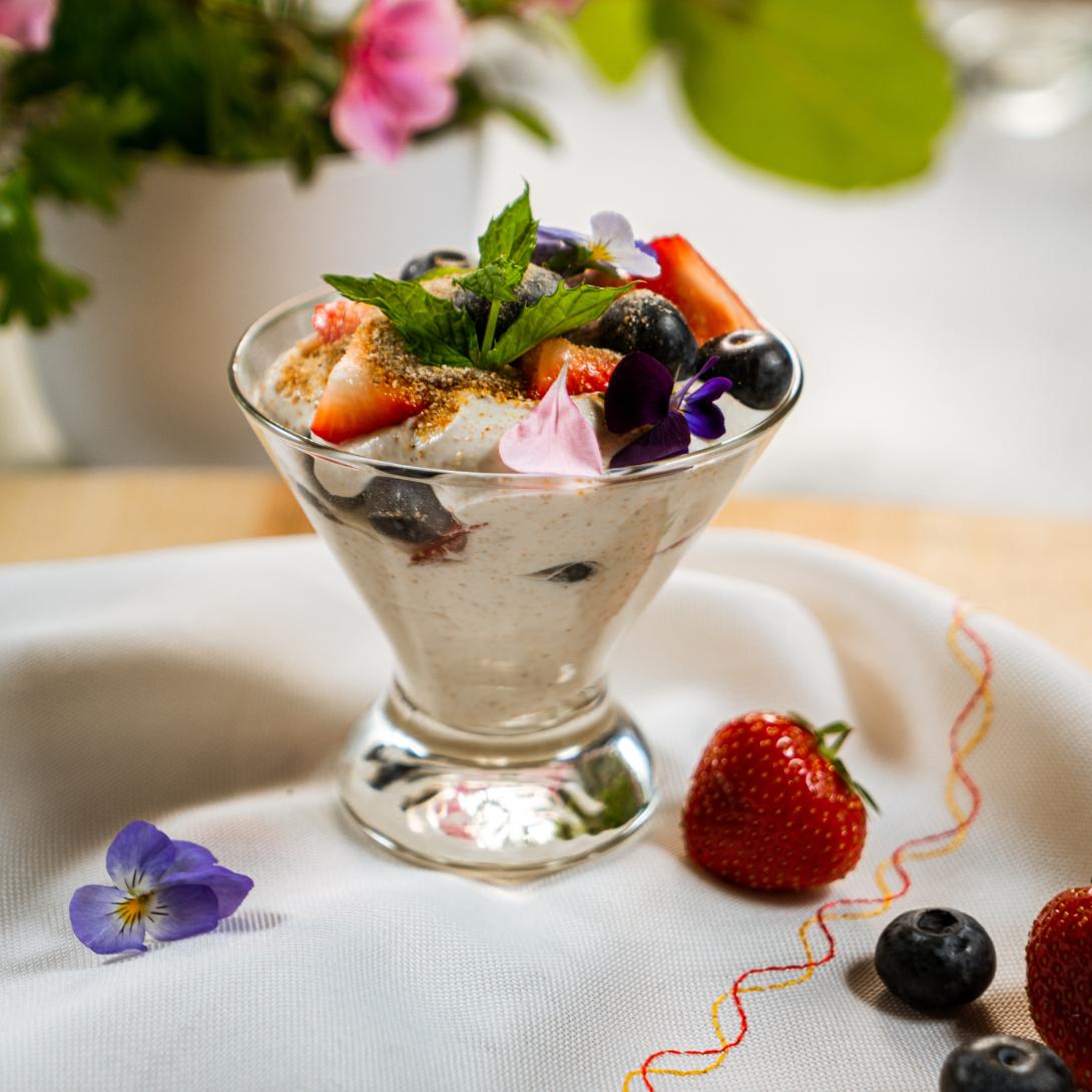 - Pane serveerimispokaalide põhja lusikatäis kreemi, seejärel pooled marjad, siis jälle kreemikiht ning kõige peale ülejäänud marjad. Tõsta magustoiduga pokaalid külmikusse vähemalt 15 minutiks.