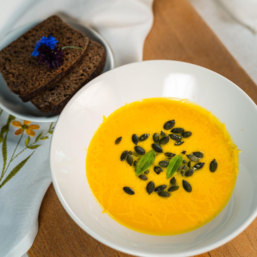 - Tõsta supp kaussi ja puista peale nii röstitud kõrvitsaseemneid kui ka riivitud juustu.