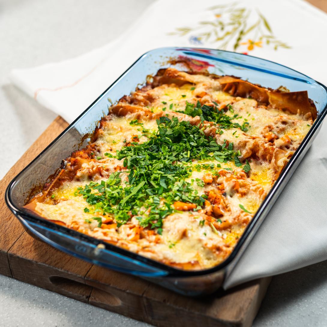 6. Küpseta ahjus 180 kraadi juures fooliumiga kaetult 40 minutit, seejärel eemalda foolium, puista lasanje ühtlaselt riivjuustuga üle ja küpseta fooliumita veel 5 minutit.