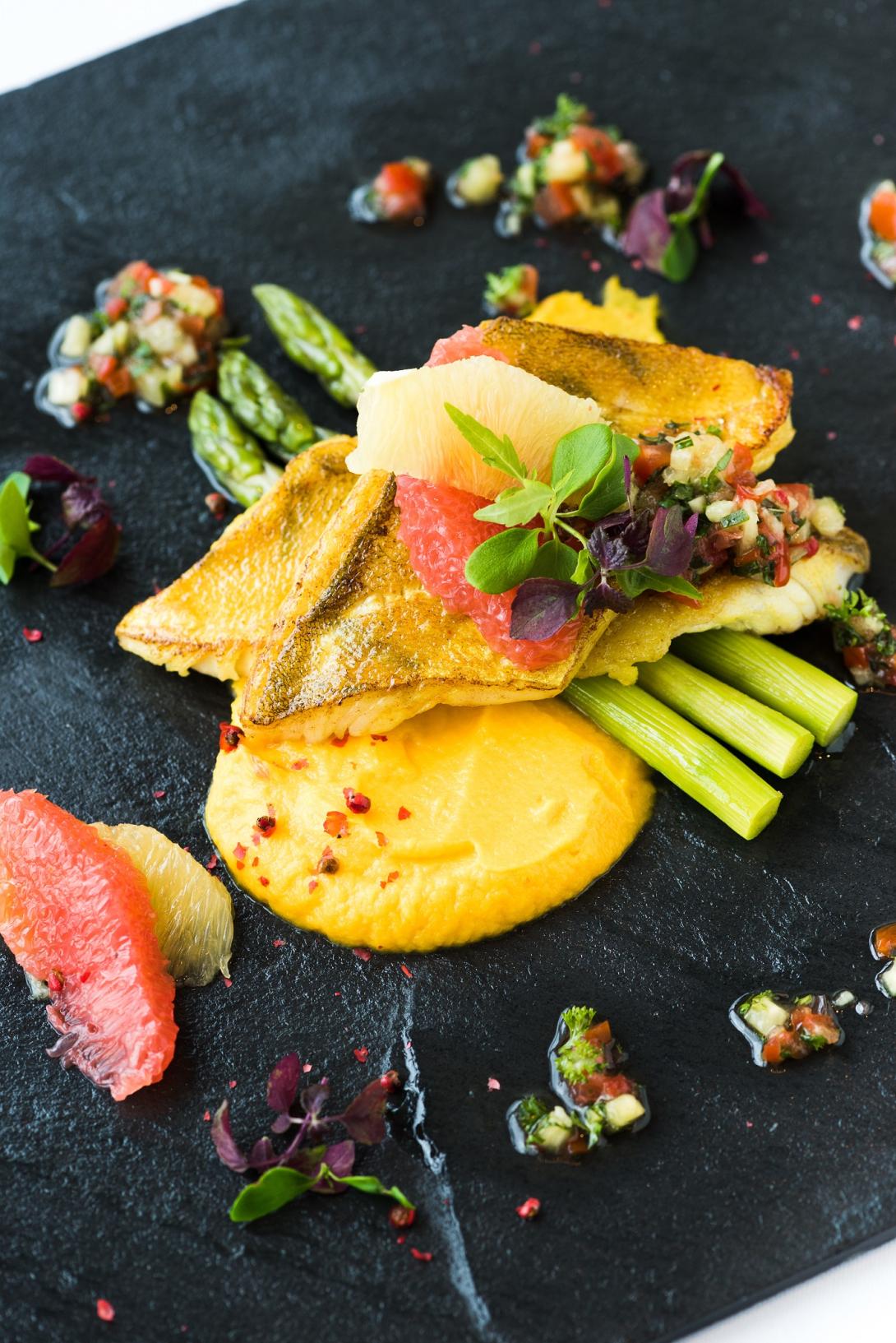 Praetud kohafilee, porgandikreem, roheline spargel, tsitrusviljad, virgo kaste