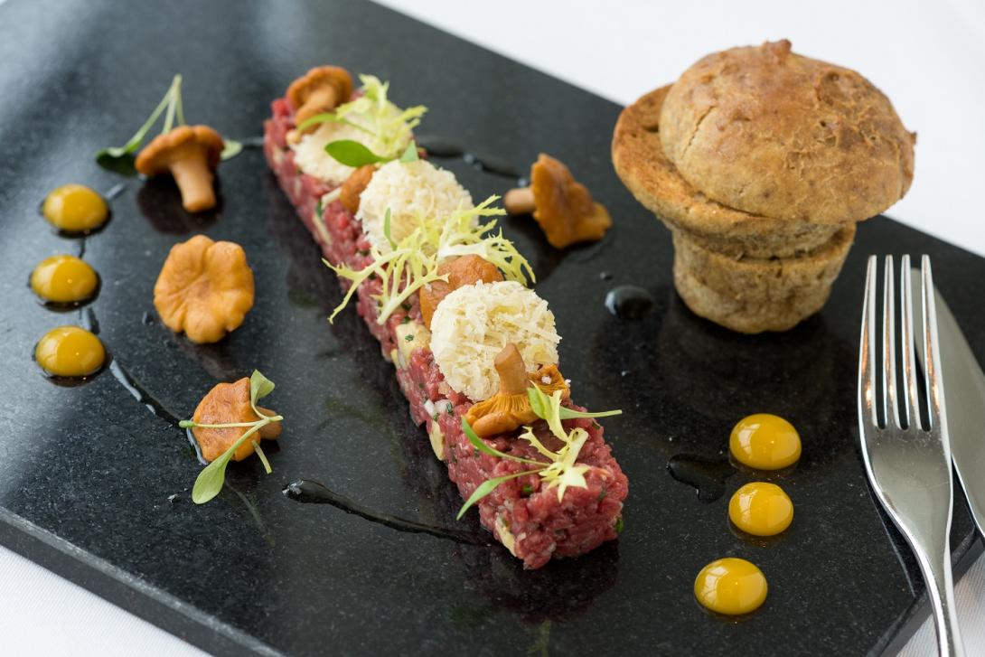 Veisetartar, marineeritud kukeseened, kivipuraviku saiake, forte juustu krõpsud