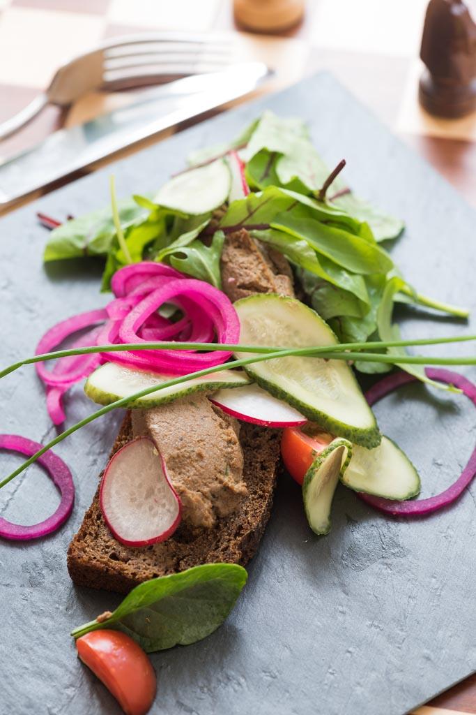 Veisemaksapasteet serveeritud käsitööleival marineeritud kurgi ja sibulamoosiga