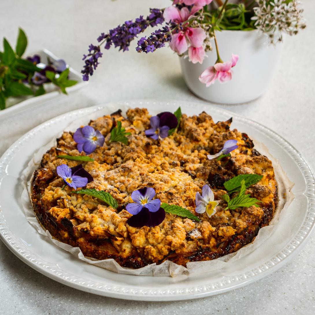 - Laota koogivormi ühtlase kihina 2/3 tainast, puista sellele õunatükid ja seejärel kõige peale ühtlase kihina ülejäänud tainas. Küpseta ahjus 180 kraadi juures 30–35 minutit.