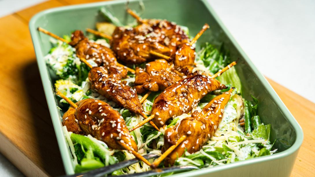 1. Sega kokku marinaad tšilli- ja sojakastmest. Vala kanasisefileed sellega üle ja aseta marineerima, kuniks valmistad salatit. Kui sisefileed poest ei leia, võta tavaline kanafilee ja lõika sellest pikuti umbes sentimeetripaksused ribad.