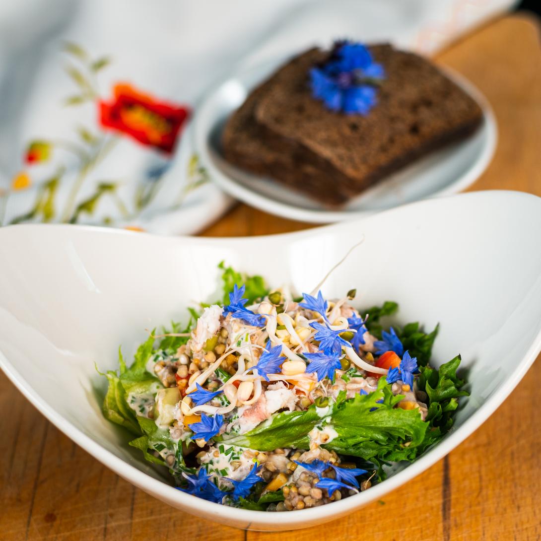 - Tõsta toortatrasalat salatilehele. Piserda lusika abil salatile kastet ning puista peale kalatükke.