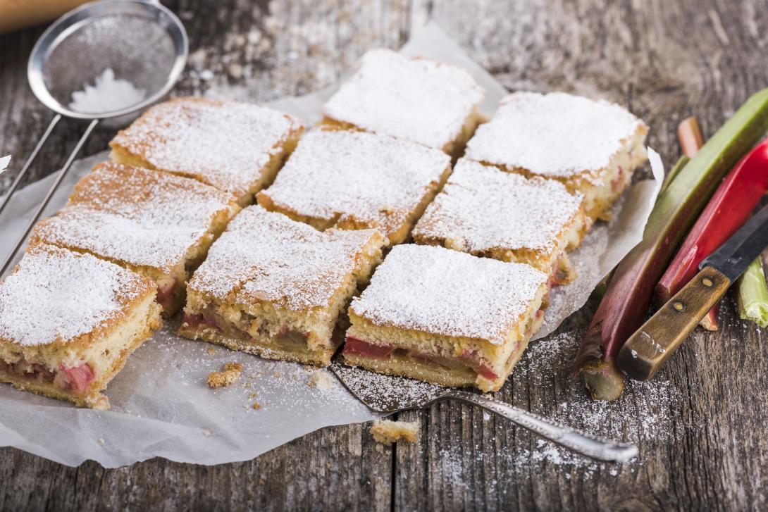 Для бисквита взбейте яйца с сахаром в крепкую пену (8-10 минут), добавьте смешанные между собой муку и картофельный крахмал и осторожно всё перемешайте. Выложите предварительно выпеченную основу из рассыпчатого теста нарезанными кусочками ревеня (молодые стебли ревеня чистить не нужно), посыпьте сахаром, сверху налейте бисквитное тесто и равномерно распределите его по поверхности. Убавьте температуру в печи до 180 °C и выпекайте пирог 20-25 минут. Перед сервировкой посыпьте сахарной пудрой.