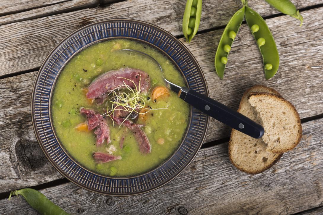 Гороховый суп – классическое блюдо на Масленицу. Небольшая хитрость – в конце варки добавьте в гороховый суп небольшое количество замороженного горошка, так вы получите более яркий цвет и свежий весенний вкус.
