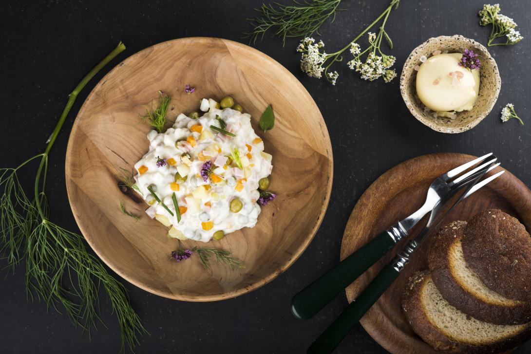 За день до приготовления салата отварите картофель и морковь в посоленной воде, не снимайте кожуру перед варкой. Дождитесь полного остывания. Для приготовления салата почистите вареный картофель и морковь и нарежьте их мелкими кубиками. Нашинкуйте вареные охлажденные яйца. Нарежьте огурец, яблоко и колбасу мелкими кубиками, добавьте консервированный горошек. Перемешайте соус из сметаны и майонеза и приправьте солью и перцем. Полейте салат соусом и слегка перемешайте. Оставьте на пару часов, чтобы салат пропитался соусом.