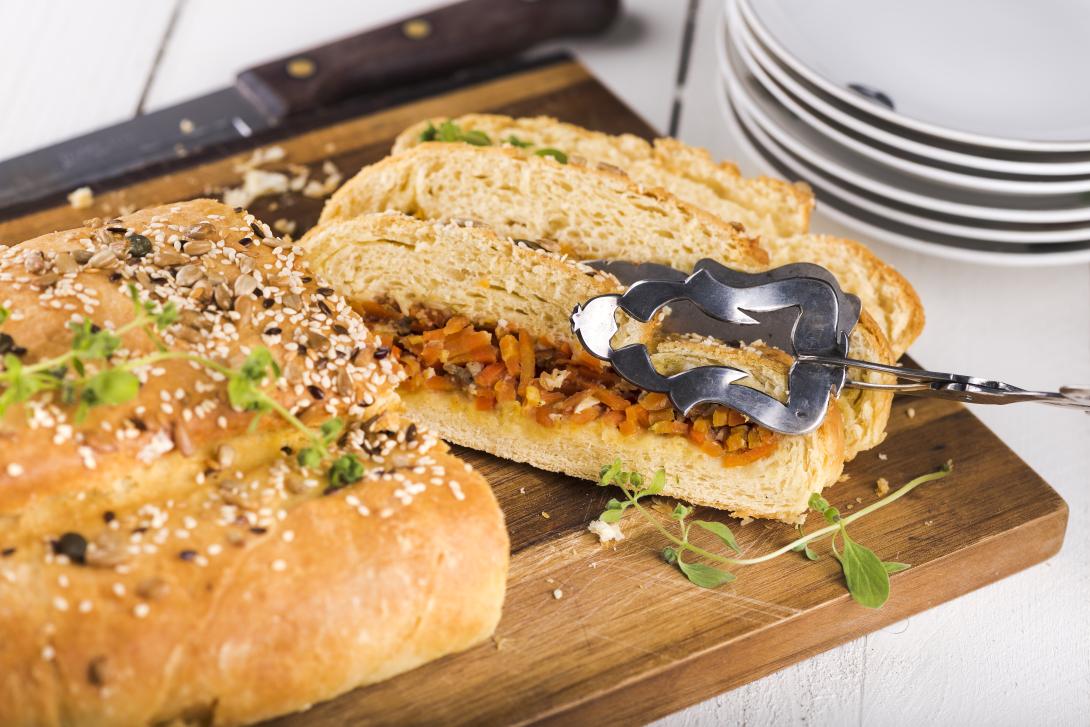 Для приготовления пирога раскатайте тесто в слой толщиной 3 мм (35×25-30 см), поместите вдоль теста начинку и придайте пирогу форму, завернув края теста друг на друга и прищипнув их между собой. Дайте пирогу немного подняться перед закладкой в печь. Смажьте пирог сверху взбитым яйцом и выпекайте при 180 °C до появления золотисто-коричневой корочки.