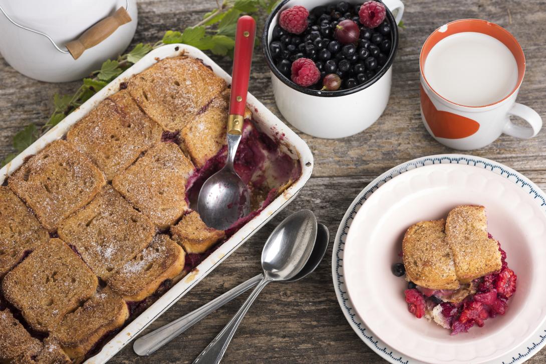 Растопите масло в кастрюле, положите в нее кусочки яблок, чернику, лимонную цедру, вылейте лимонный сок, добавьте сахар и томите, пока яблоки не станут мягкими. Разведите кукурузный крахмал в небольшом количестве холодной воды и добавьте к смеси. Нагрейте еще раз и после этого снимите с плиты остывать. Выложите дно формы ломтиками булки, сверху положите слой начинки из яблок и черники, снова закройте ломтиками булки. Приготовьте смесь из яиц, сахара, корицы и ванили и залейте равномерно в форму. По желанию посыпьте сверху еще сахаром и корицей. Выпекайте при 180 °C до появления золотисто-коричневой корочки.